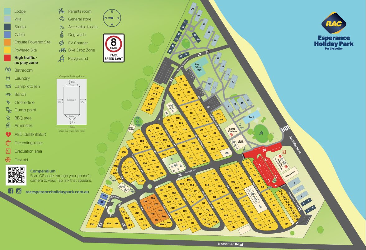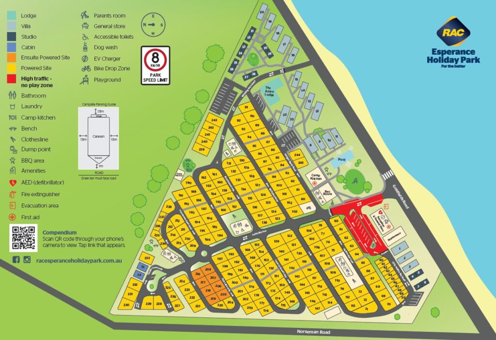 View or download our RAC Esperance Holiday Park map. See our accommodation layout, find your way around the swimming pool, BBQ facilities, recreation areas and more.